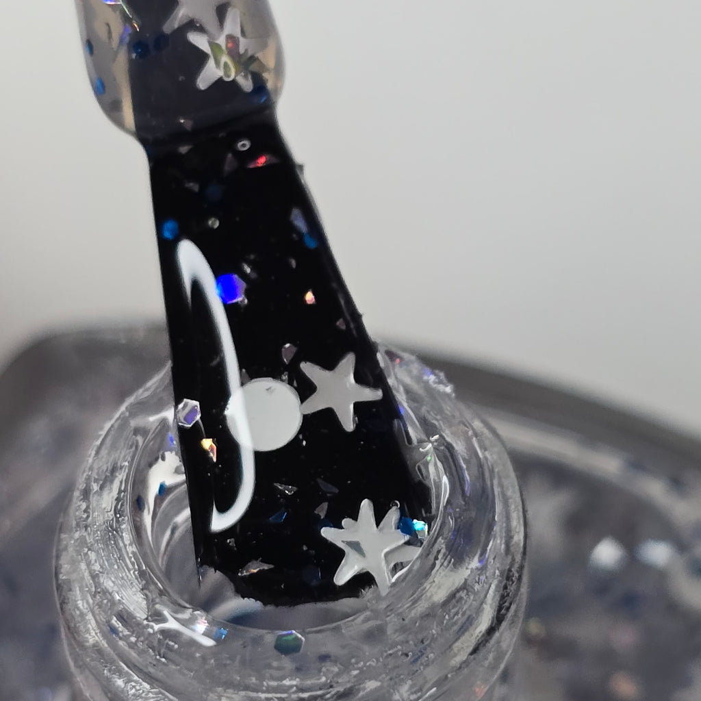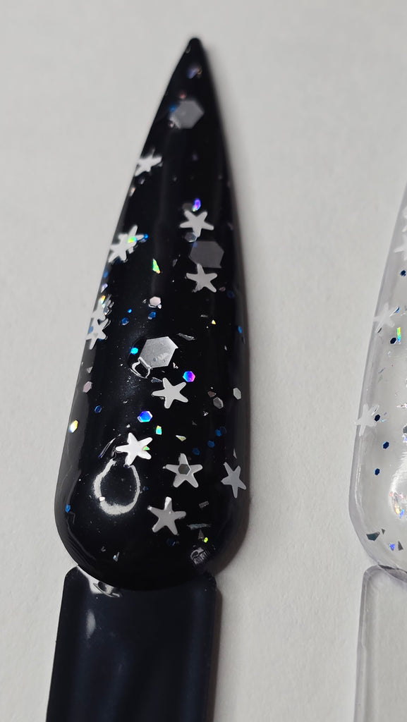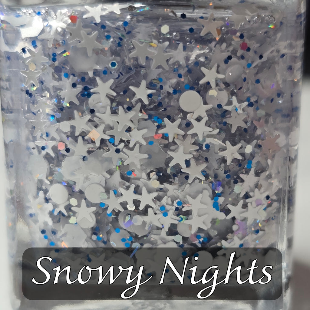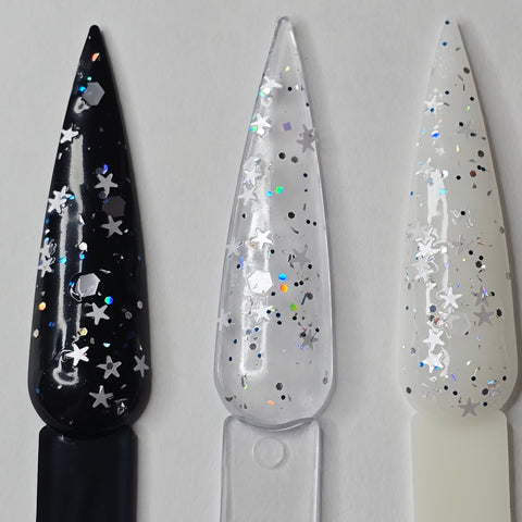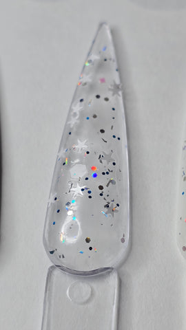This is a glitter heavy topper with a mix of white stars, flowers, circles, and heaxagons along with silver mini shreds, and silver and blue microglitter.