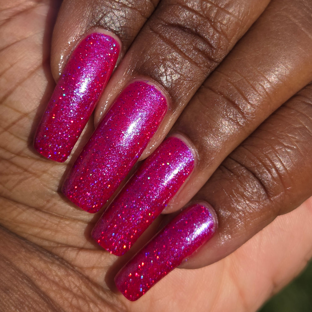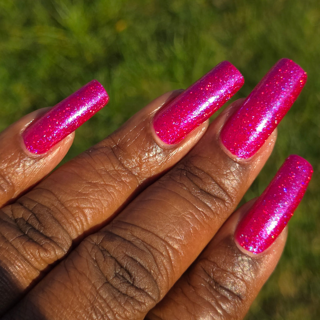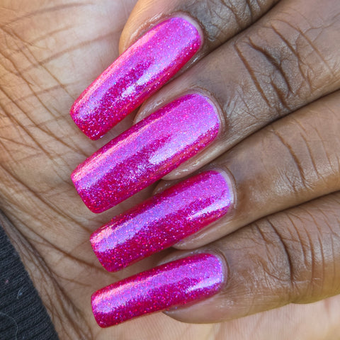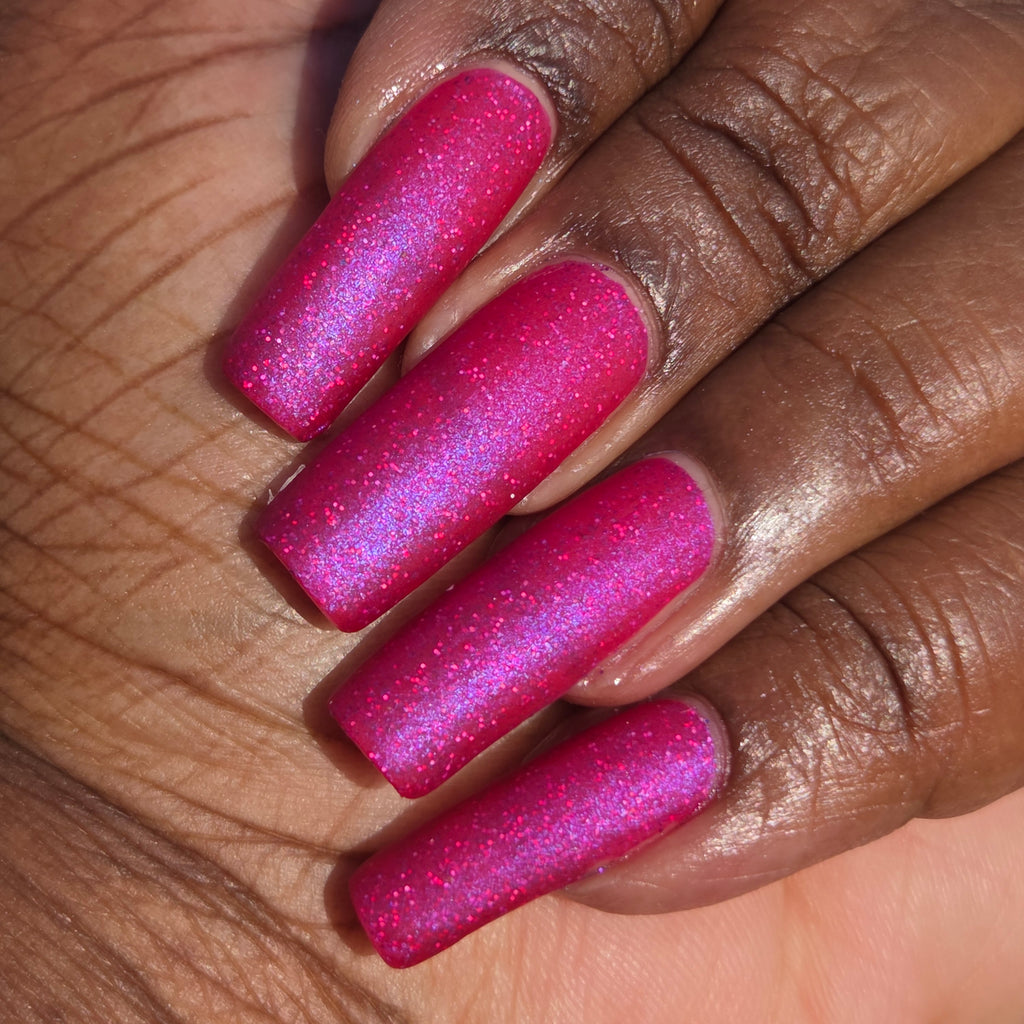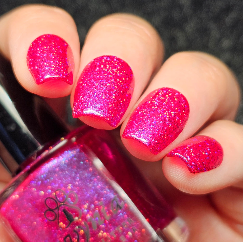Dating Everyone: You can rock this polish while you run around your new town romancing every single character that lives there. Also a not-so-subtle nod to the bisexual flag, because we are dating everyone. This polish is a bright magenta base with aqua blue sparks and light purple holographic glitter.