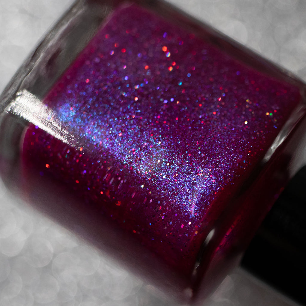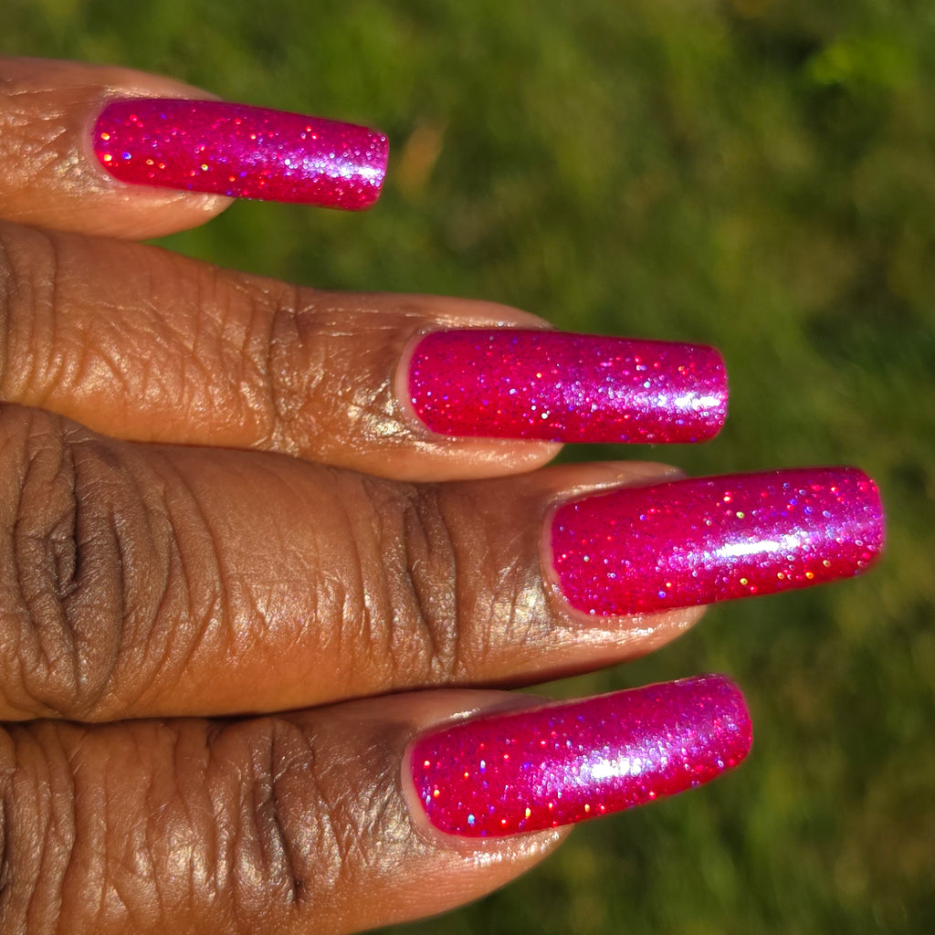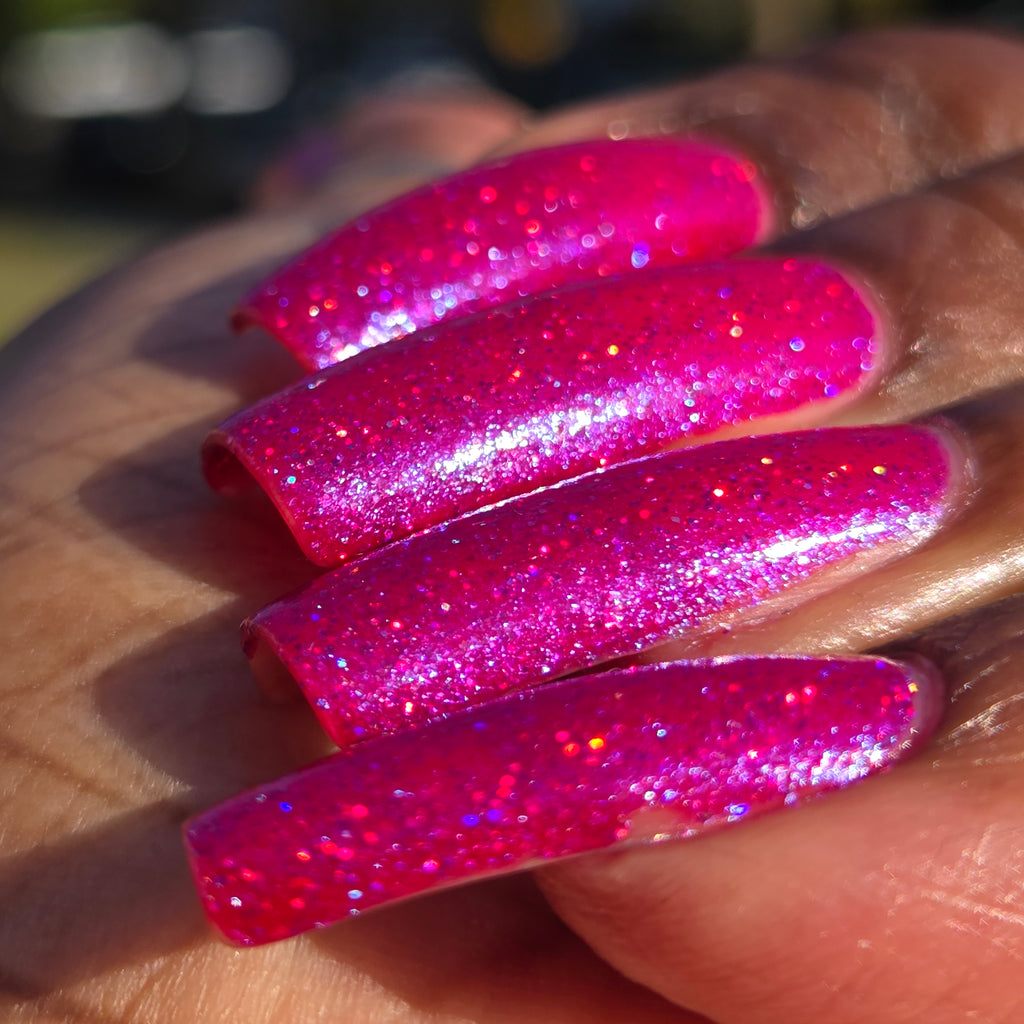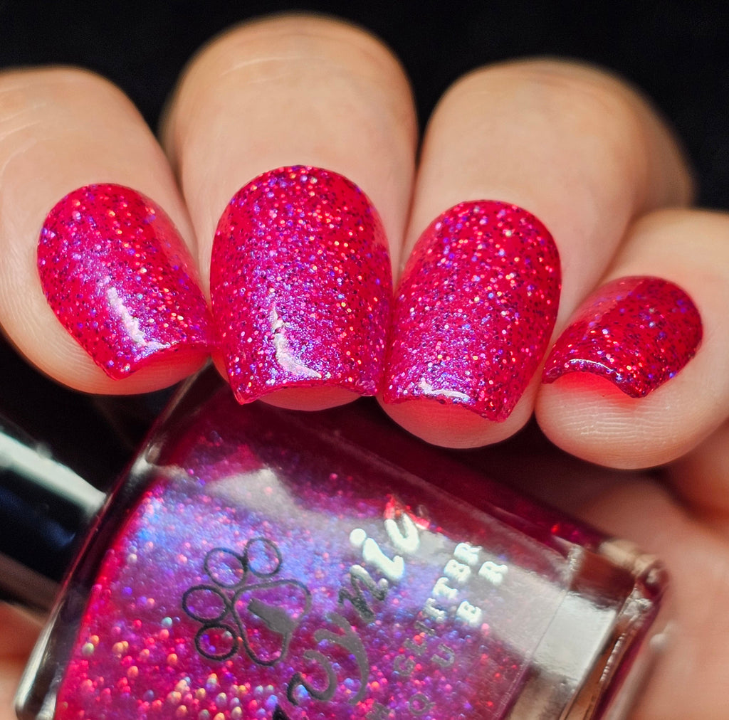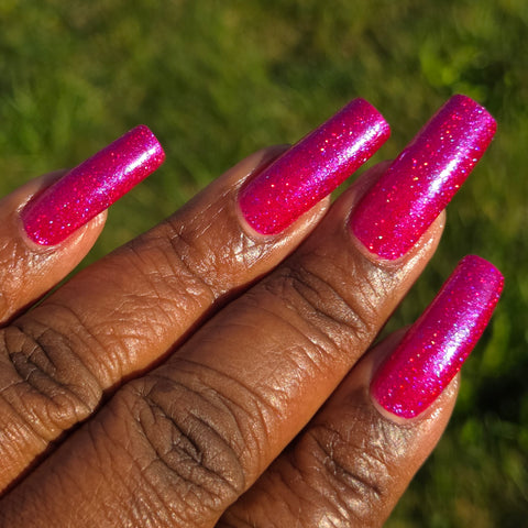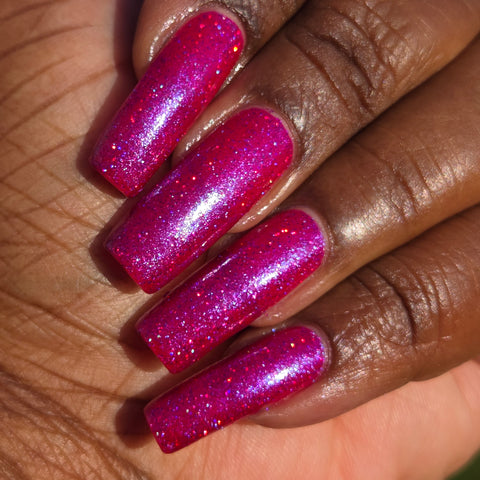 Dating Everyone: You can rock this polish while you run around your new town romancing every single character that lives there. Also a not-so-subtle nod to the bisexual flag, because we are dating everyone. This polish is a bright magenta base with aqua blue sparks and light purple holographic glitter.