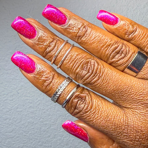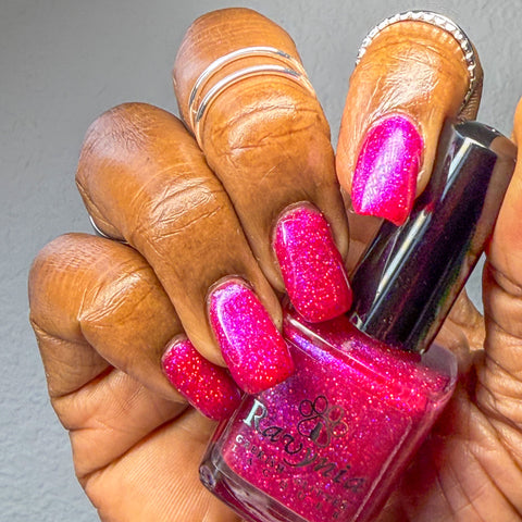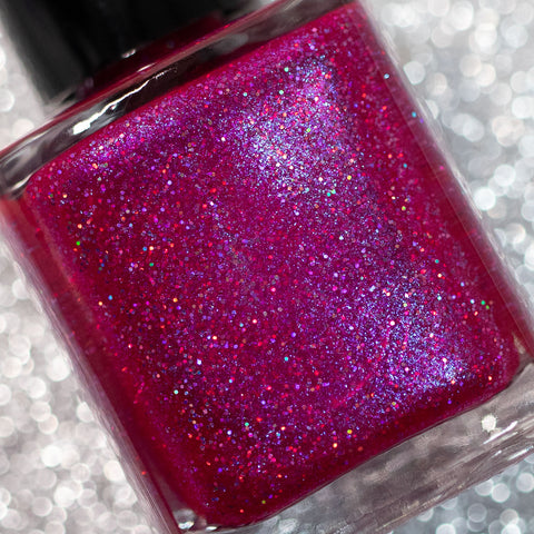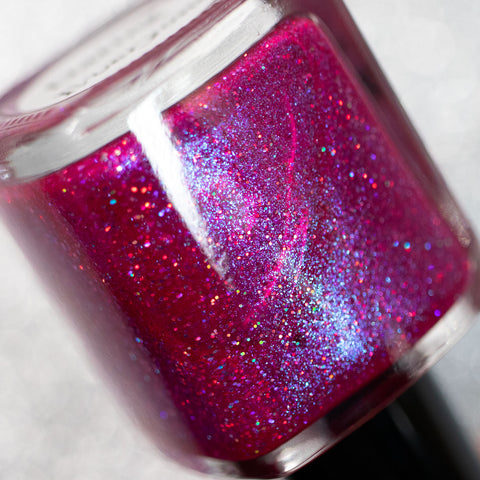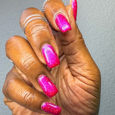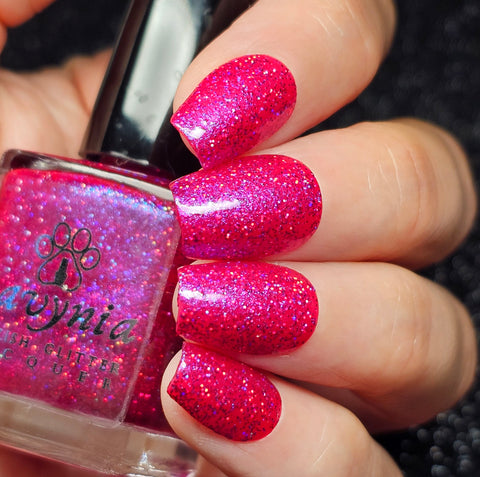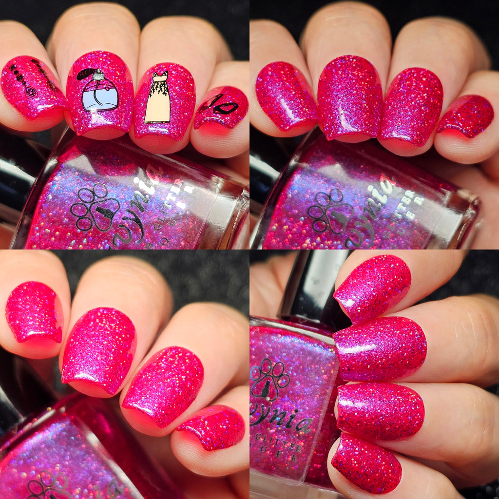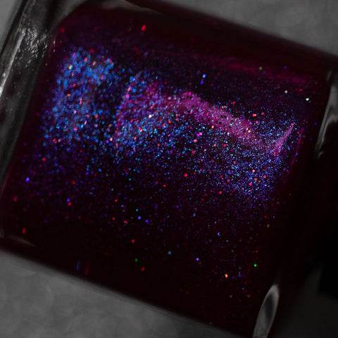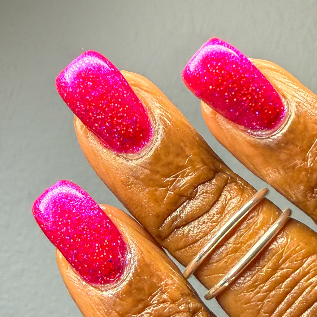 Dating Everyone: You can rock this polish while you run around your new town romancing every single character that lives there. Also a not-so-subtle nod to the bisexual flag, because we are dating everyone. This polish is a bright magenta base with aqua blue sparks and light purple holographic glitter.